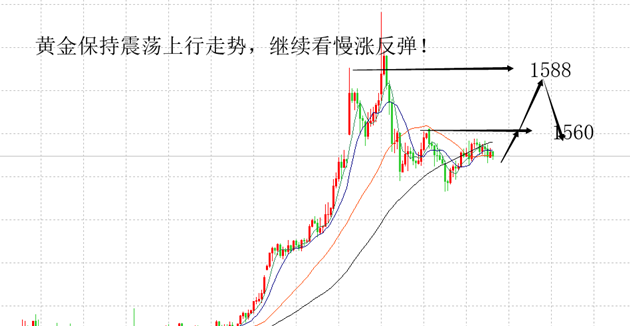 技术面,黄金周K线收一根带长下影线十字,价格下探5周均线附近获得支撑回升,MACD在零轴上方金叉向上,说明黄金整体保持在强势趋势之中。日价格整体上维持在20日均线上方,长期均线保持多头向上的态势并未改变。从价位来看,金价回撤在1536区域获得支撑,该位置刚好是前波上涨回撤的50%位置,属于强支撑因此,企稳信号明显,多头再度向上延续的可能性增加,因此,下周金价回撤后逢低参与多头为主。压力位:1562,1572,1580,支撑位,1548,1541,1536