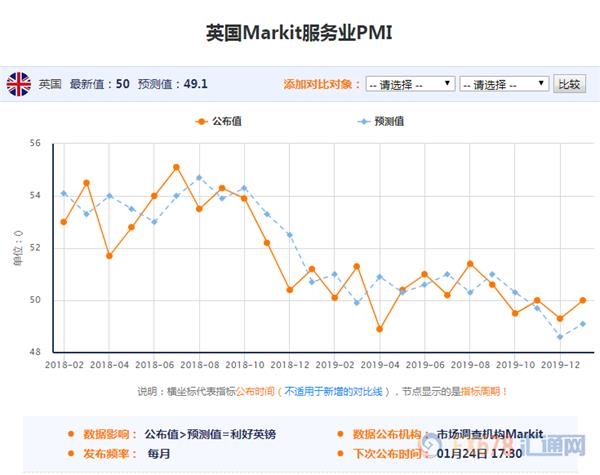 其次,英国1月Markit服务业PMI初值也需要予以关注,因为服务业在英国的GDP统计中占比较大,因而对英镑(1.3008, -0.0070,-0.54%)的影响较大;英国11月服务业PMI为49.3,2016年7月以来最低;英国12月服务业PMI回升50.0;目前市场预计1月服务业PMI将进一步回升至50.7,有望在数据出炉前给英镑提供一些支撑。