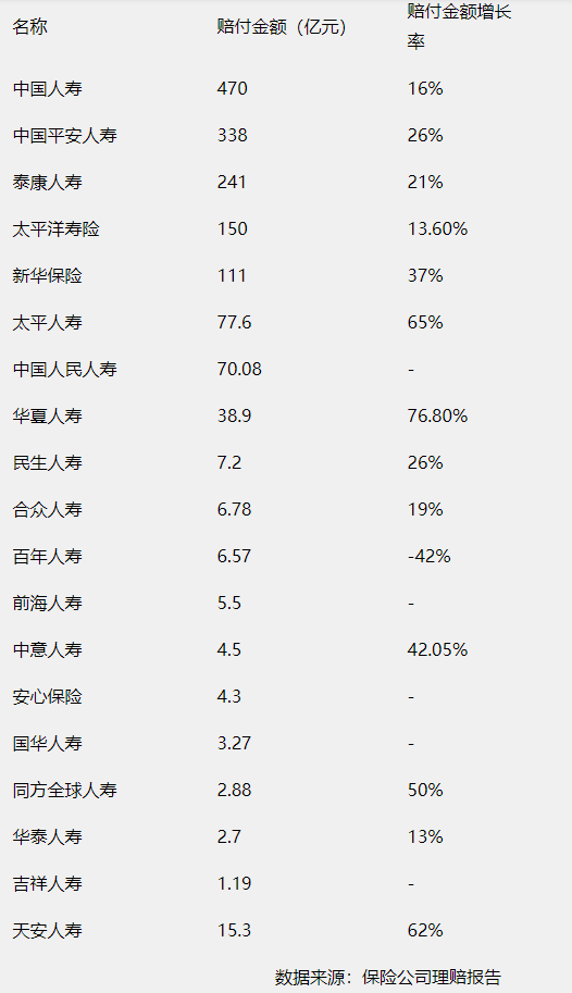 从赔付金额上看,19家发布理赔年报的公司理赔金额均超亿元,其中中国人寿2019年赔付金额达到470亿元,华夏人寿赔付金额增长率达到了76.8%,百年人寿今年赔付金额为6.57亿元,较去年的11.4亿元有所下跌。对比几家公司发布的理赔十大案例,平安人寿最高曾赔付1696万元。