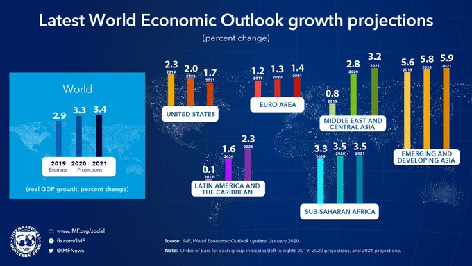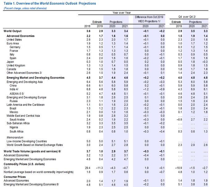 在报告中,IMF预计,2020年全球经济增速为3.3%,此前预期为3.4%;预计2021年全球经济增速为3.4%,此前为3.6%。2019年则是创下10年前金融危机以来的最小增幅2.9%。2019及2020年的估计值都较10月时的预估下修0.1个百分点。