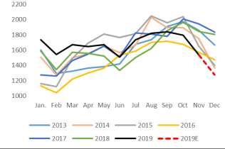 将豆棕两大油脂合并为一个主题主要因为年内两大油脂从走势上来看确实具有较多的共性,一方面,进入三季度前,豆棕油整体都处于持续的下行通道中,单边基差均整体承压,而9月份后,伴随着双节备货旺季的到来,豆棕油均因各自不同的基本面因素开启一轮强势的上涨行情。而相比于走势的高度拟合,二者基本面则表现出截然不同的特点,具体而言,棕油整体供需两旺,豆油则是供需两淡。年初因产地悲观预期导致产业抛售加剧,国内棕油进口利润窗口持续打开,前期因高位豆棕价差下棕油表现出较强的消费特征,行情走势上具体表现为基差羸弱+单边缓跌的走势,但随着进口利润持续放大以及到港数量增加棕油累库也在逐步加剧,棕油单边开启了一段相对流畅的下跌行情并一路持续至8月中下旬。受累于棕油持续下跌影响,连豆油也整体面临颓势,虽然期间国内一豆也曾伴随有短暂的基差上涨行情,但提货终究持续弱势萎靡。更为重要的是,期间因禽料消费增加以及配方调整等因素导致豆粕消费表现得异常强势,5-6月期间豆粕消费同比增幅高达一度高达10%。同期,因贸易战出现反复豆粕基差涨势强劲,M79,M91月差均走出相对流畅的正套转结构行情,而压榨升温也切断了豆油的最后一根救命稻草,时值国际原油大幅下跌以及南美种植炒作,油粕比走势与年前预期大幅反向,豆油旋即开启漫长的下跌模式。本轮下跌过程,除豆油消费异常偏弱并伴随出相对流畅的y91月差反套走势,yp2009价差在不经意间也达到了1200以上的历史同期超高水平,伴随单边月差持续走弱,连棕油在国外洗船声中开启一轮较明显的触底反弹行情,产地价格迅速走强,带动进口利润快速收窄。但此阶段,国内豆油则表现得更加强势,5月期间豆粕强劲消费更似昙花一现,因猪瘟在华中、西南地区迅速扩散,国内压榨异常减温,随即同比降幅达到10%以上,这也令市场所担忧的油脂供应下滑开始逐步体现出来,期间,豆油基差底部抬升。伴随着双节备货启动,豆油去库预期开始逐步体现并随即开启一轮凌厉的单边上涨行情,开启油脂绝地反击的首轮号角,随即油脂利好频传,在经历10月初油脂行情的阶段调整后,棕油接棒豆油开启反弹模式,本轮国内棕油上涨均因产地带动所致,前文在国际部分均有所解读,此处不再赘述。而伴随着豆油消费的持续好转,国内低棕市场则出现了阶段性的累库行情,基差一度上涨承压,但因产地对此轮涨价过于坚决,国内进口利润一度倒挂至500元/吨附近,市场买船稀少,贸易商挺价积极,市场普遍惜售,货权整体较为集中,因而即使到港数量持续增加,p15价差仍开启一轮强势的上攻模式。这与年内y15月差的震荡反复表现出较明显的不同,虽然y01合约属于传统弱势合约,但因豆油基差上涨强劲,近月仍有较明显支撑,因而15合约即使出现贴水交割,但近月现货支撑也表现得异常明显。