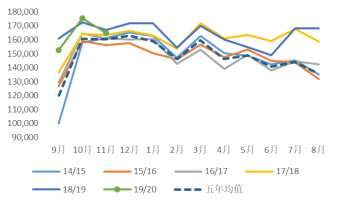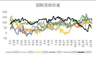 关于国内猪瘟问题,市场已有了较为充分的认识,但与去年年末至今年年初市场交易油粕比有所不同的是,年内对于豆粕弱势需求的情况由预期开始逐步转为现实,M15价差罕见的收至接近full carry结构也充分反应了猪瘟对于粕类需求的压力。不过从走势来看,油脂启动领先于豆粕,这与二者基本面差异有关,尤其是年末豆油的强势需求也在很大程度上对豆油行情产生助推。不过总体来看,我们认为豆粕需求可能还是难以出现恢复,相对于豆粕需求18/19年下降的走势来看,19/20年更倾向于筑底抬升的走势,但我们认为抬升的速率整体还是会慢于下滑的速率,因而短期来看,豆粕需求可能还是比较难有太大起色。而另一方面,当前豆棕价差价高也对豆油消费有一定的提升作用,因而短期来看豆油19/20年仍然维持较乐观态度。