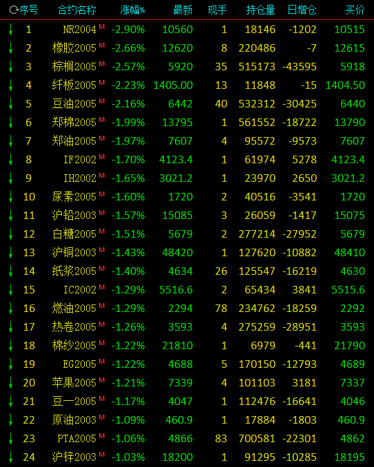 新浪财经讯 1月21日,国内期市大面积收跌,三大油脂跌幅居前,棕榈油、豆油跌逾2%,菜油跌近2%,其他农产品中,棉花跌近2%,白糖、苹果、豆一跌逾1%,菜粕、豆粕逆势涨逾1%;能化中,20号胶、橡胶跌近3%,有色与黑色系中,沪铅、沪铜、热卷跌逾1%。