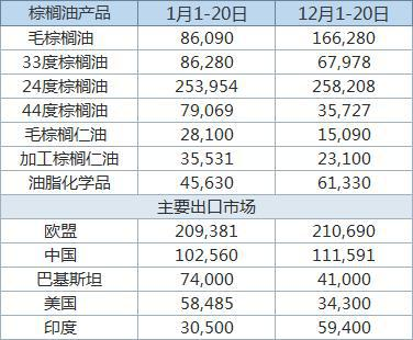 以下为SGS公布的马来西亚1月1-20日棕榈油产品出口数据(单位 吨):
