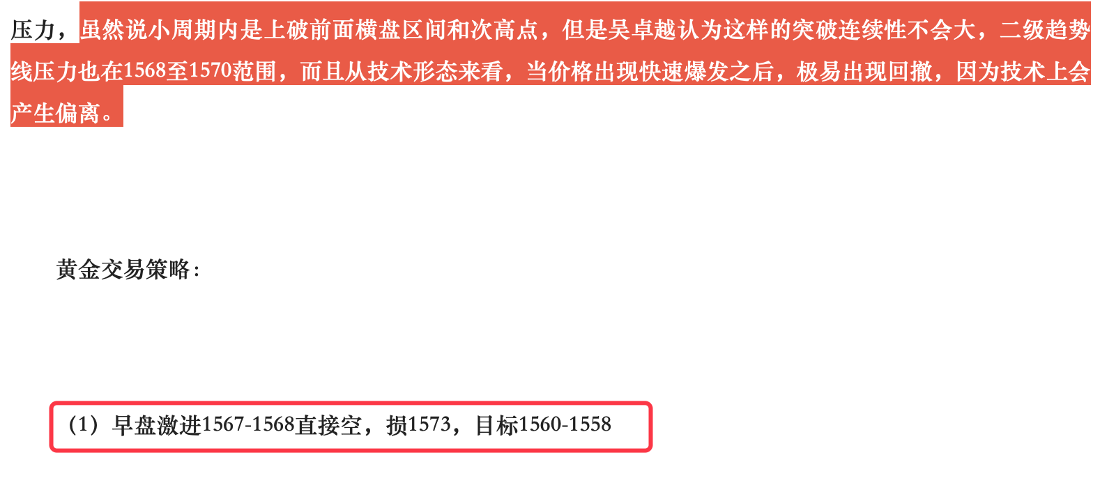 对于今日黄金的策略观点吴卓越在早盘的文章里已经写的非常清楚,虽然说小周期内是上破前面横盘区间和次高点,但是吴卓越认为突破连续性不会大,二级趋势线压力也在1568至1570范围,而且从技术形态来看,价格出现快速爆发之后,极易出现回撤,因为技术上会产生偏离,今天早上只是几个*发射,没有人员伤亡,主力只是为了拉高出货。全网99%分析师一个劲的直接多,已经都凉透了,而吴卓越早间为什么在行情那么强势的情况下还要去做空,理由已经说的很明确了。全网标题给出1568空单,日内最高点空,空单大赚!