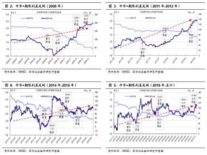 可以发现,期限利差和牛熊市具有稳定的关系,过去的四轮牛市,期限利差均走阔,过去的四轮熊市,期限利差均走平。
