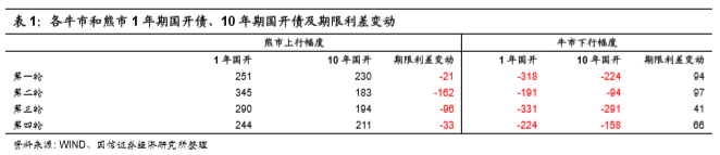 然后比较牛熊周期中1年期国开债变动幅度和期限利差变动幅度,这两者有一定的相关性。