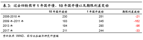 然后熊市周期来看,上行幅度最大的2010年这次,期限利差缩窄幅度最大,上行幅度略小的第一轮和第四轮,期限利差走平的幅度较小。