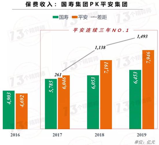 2019年,平安集团再次将差距拉开,以7,946亿元的保费收入,领先国寿集团1,493亿元,两者差距较2018年再次加大。