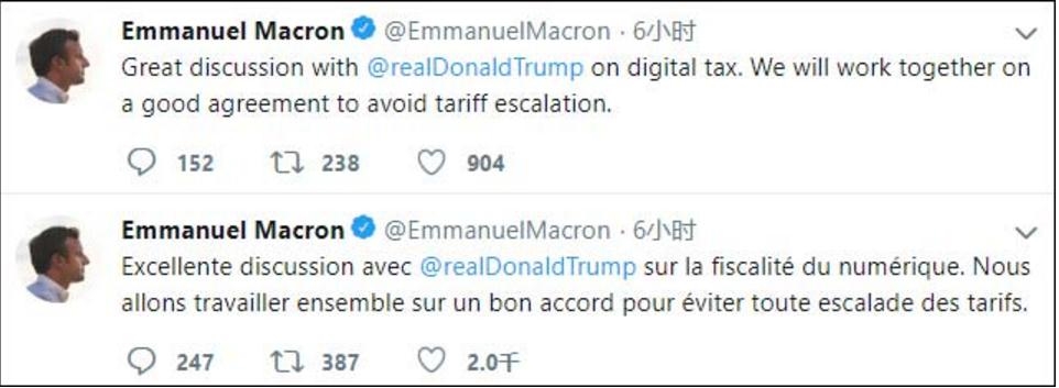 20日,马克龙发推并@特朗普表示,与特朗普就数字税进行了精彩的讨论,将共同努力达成良好协议,避免关税升级。马克龙用法语、英语各发了一遍。