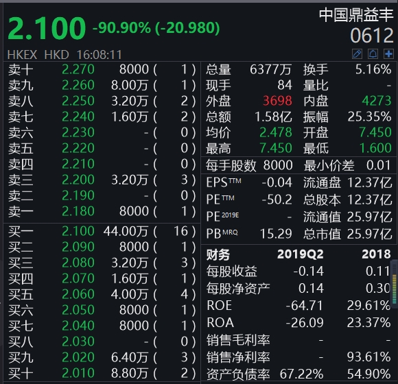 根据中国鼎益丰2019年中报显示,公司每股资产净值为0.14港元,按照记者发稿期间2.64港元股价,意味着中国鼎益丰股价还会在继续大跌95%。