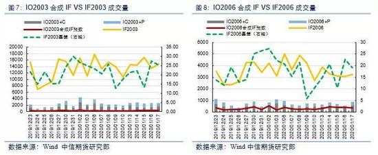那是否代表在12月IF基差的回归是由IO上市合成推动的呢?我们认为并不一定。一方面,纵向对比来看,在2020年1月13日到1月17日,随着主力合约切换至IF2002,IF2002的成交量从5000张迅速放大至5.5万张,而 IO成交量并未有明显改变,若按照IO推升IF基差的逻辑,这一阶段IF2002基差应当有明显变化,但同期基差稳定在升水16个指数点,未有明显变化,因此难以明确IO2002影响IF2002的推论。另一方面,横向对比2003和2006两个月份,IO合成的期货合约张数远小于对应IF合约成交量,理论上IO的成交量几乎对IF没有影响;但IF2003和IF2006合约的基差走势与IF2002几乎同步,因此侧面排除了IO2002影响IF2002的假设。