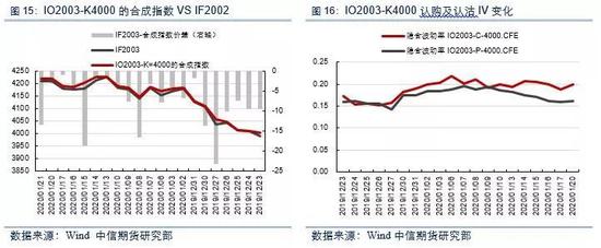 那原因在哪里?我们认为可以从认购和认沽期权IV变化得到一定启发。若IF较期权合成指数有明显贴水,那么正常操作应当做空合成指数,同时做多IF从而推升基差。因此,在期权端的操作将偏向于卖认购和买认沽,认沽的IV应当高于认购。但是我们发现在上市初期,IO2002行权价4000的合约中,认购期权的隐含波动率IV持续高于认沽的隐含波动率IV。出现这样的原因或在于国内期权市场的习惯,即更偏向于做认购且买权。因此,或可以反向推断期权推动基差的效果有限。而若以期日较远以2003为例,也同样显示了认购IV高于认沽IV的情况。