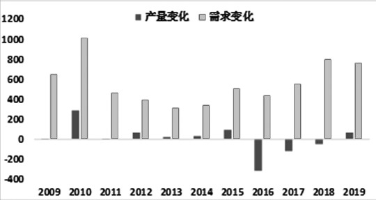 2019年,恒力石化2000万吨/年的加工能力投产,需求增量大约为40万桶/天。根据“两桶油”2019年三季度的季报显示,“两桶油”2019年前三季度加工量增量大约为20万桶/天,恒力石化及“两桶油”的增量构成了中国原油需求的主要部分。在全球其他国家原油需求增速急刹车的背景下,中国原油需求仍能够保持大幅增长,不得不让人感叹中国市场的巨大潜力。