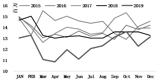 从中国的原油产量来看,近三年中国原油产量一直维持在380万—390万桶/天之间,变化相对较小。既然中国原油产量无法提供足够的供给,那么也就只能通过进口端来弥补。2019年,中国原油进口量增长72.4万桶/天,同比增长8.25%,接近需求的增量,整体的原油进口依存度也达到了前所未有的73.85%。