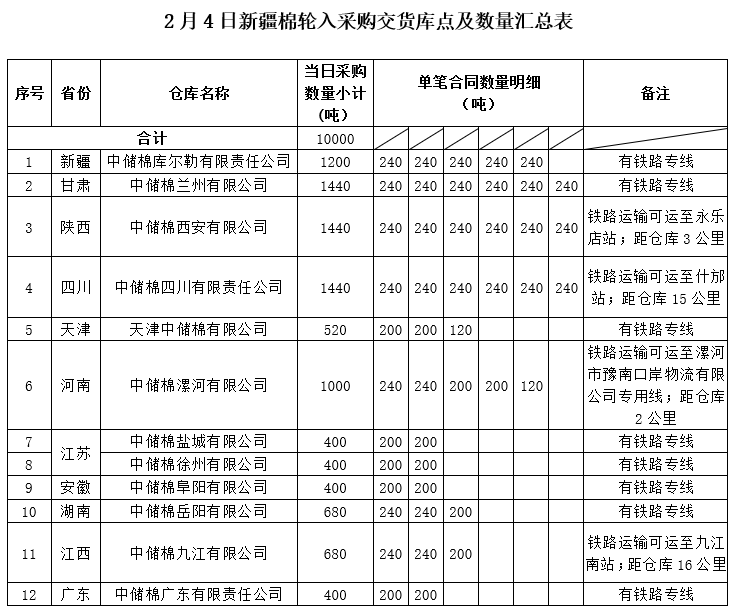 原标题:轮入预告|2月4日新疆棉轮入采购交货库点及数量公告