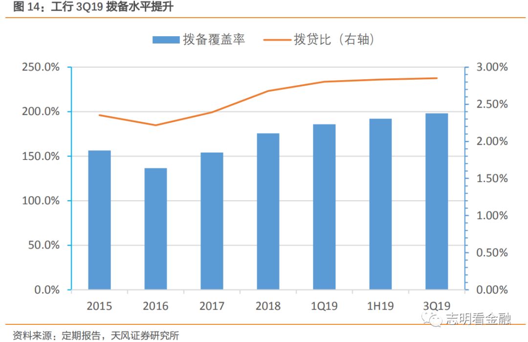 随着多年的信贷结构调整优化,工行信贷资产质量对经济周期的敏感度下降。3Q19不良贷款率1.44%,较1H19下降4BP,自16年以来持续下降。1H19关注率与逾期贷款率指标均改善。此外,3Q19拨贷比2.85%,较1H19上升2BP,自16年以来持续提升,风险抵补能力明显增强。