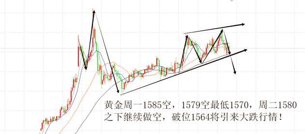 周一一波大跌最低在1569附近,在大多是人跟风看多的情况之下。很明显,市场不会受人多人少影响,技术面会受到外界因素影响,但总体来看,最终还是回归到技术面。革命尚未成功,你我还需坚持。目前黄金右肩的部分虚高1593,但右肩依旧存在,2月康静坚持看空黄金,本周同样坚持看空黄金不变,那么,日内黄金还是围绕美盘的二次高点1581*交易,多空都有机会,今天的行情不会像周一一样亚欧盘走出大跌,今天的行情重点预计放在美盘,美盘会下跌一波,破位1570,可见1563,康静一直强调1563是本周期空头放量的关键点,跌破之后市场的导向开始转向做空,那么下跌就正式开启