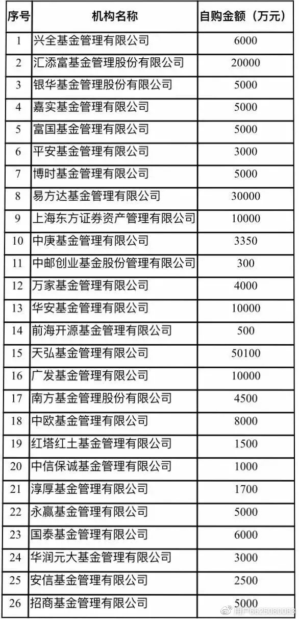 此外,汇添富、易方达、东方资管、广发基金、华安基金等5家公募基金的计划自购金额均超过1亿元。