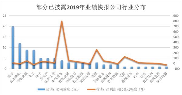 银行业公布业绩快报的公司数量最多,共有20家,2019年实现净利润共计3978.61亿元,同比增长10.89%。其次是公用事业行业,有12家公司公布了业绩快报,实现净利润共计281.09亿元,同比下降4.67%。