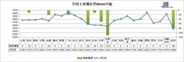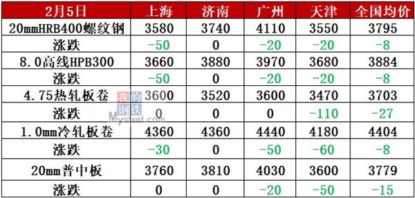 中厚板:2月5日,全国24个主要城市20mm普板均价3779元/吨,较上个交易日下跌15元/吨。其中,杭州、合肥、广州、北京、武安等8个城市中板价格下跌10-110元/吨。