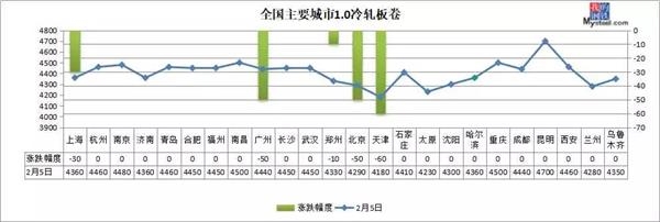 冷轧板卷:2月5日,全国24个主要城市1.0mm冷卷均价4404元/吨,较上个交易日下跌8元/吨。其中,上海、广州、北京等5个城市冷卷价格下跌10-60元/吨,其他城市持平。