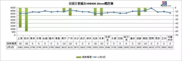 建筑钢材:2月5日,全国25个主要城市20mm三级螺纹钢均价3795元/吨,较上个交易日下跌8元/吨。其中,上海、杭州、广州、北京、成都等8个城市螺纹钢价格下跌10-60元/吨,其他城市持平。