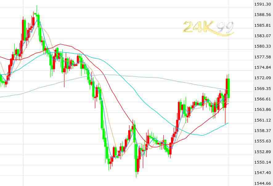 (现货黄金1小时图 来源:24K99)