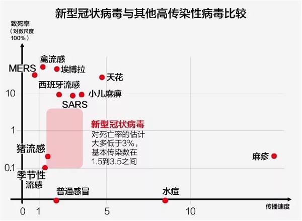 根据最新的研究,新型冠状病毒感染的肺炎目前死亡率为2%。这比每年典型流感0.1%的死亡率要高出近20倍。然而,与SARS病毒6%~7%的死亡率和中东呼吸综合症病毒35%的死亡率相比,2%的死亡率仍然要低得多。
