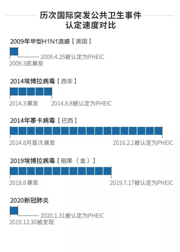 仅仅一个月的时间,新冠肺炎就上升为国际公共卫生紧急事件(PHEIC),这反映了病毒暴发的高速度。与其他几次PHEIC相比,此次肺炎疫情被确认的速度与2009年甲型H1N1流感暴发时期比较相近,都在1个月左右。