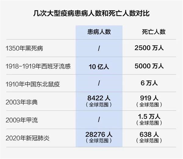 对比20世纪发生的多次大规模疫情可以发现,在现代公共卫生技术快速发展下,2020年的新冠肺炎疫情,无论是在患病人数还是死亡率上,都已经降到非常低的水平。