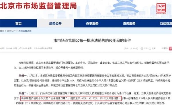 该局披露的上述案例显示,1月31日,门头沟区市场监督管理局对辖区内北京利民堂大药房有限公司的价格行为进行了检查。经查,当事人在进货价格未变的情况下,将原销售价格每个26元的“立体明星口罩”,提价至35.00元、42.50元、85.00元对外销售。当事人涉嫌违反《中华人民共和国价格法》第十四条第(三)项的规定,构成哄抬价格的违法行为。依据相关法律法规,门头沟区市场监督管理局已向当事人作出罚款10万元的行政处罚。