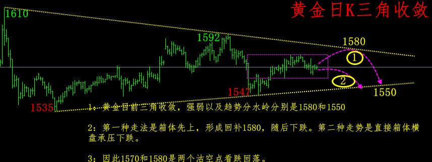 2;为什么做空?第一日K的指标MACD顶背离向下还没有得到完全的修正。还需要一次下探1555.这一次下探走完,才能定位行情后面的趋势。第二:黄金日K目前是三角收敛的承压状态,这种情况之下,黄金只能选择承压之下逢高沽空!