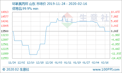 产品:据生意社大宗榜数据显示,本周环氧氯丙烷市场行情弱势运行。截至16日环氧氯丙烷企业主流报价在12000元/吨左右,与周初相比下跌了2.41%,与去年同期相比上涨了8%。因下游复工缓慢、物流运输不同程度受限影响,企业走货不佳,工厂出货承压,降低库存为主,商谈重心走弱,部分环氧氯丙烷企业暂不报价。 2月16日环氧氯丙烷商品指数为95.34,与昨日持平,较周期内最高点133.71点(2019-10-29)下降了28.70%,较2016年09月07日最低点46.85点上涨了103.50%。(注:周期指2011-09-01至今)