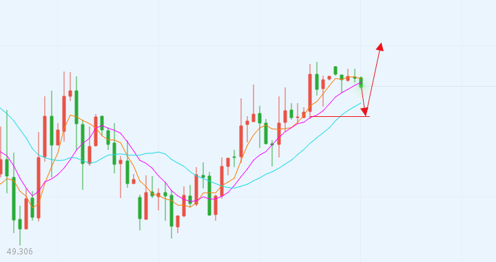 原油方面前阶段我们给出波段看涨的三个条件,第一是2019年50区域前期3底区域;第二是26为低点以来月线趋势支撑在49.5区域;第三,原油65上方下跌当前跌幅达20%以上,短期严重超跌。当前原油已经成功止跌,多头有望迎来上涨。四小时级别5、10、20日均线金叉上行,价格沿周二开始的上升支撑线一路上行。当前行情在整理蓄势中慢慢反弹。小双底颈线完成突破。初步的小周期双底反弹。布林道开始张口。依托布林道中轨震荡上扬走势。美盘的操作上依旧还是多,点位上个人建议回撤51.3-51.5一带短多,目标看破52.5一带!