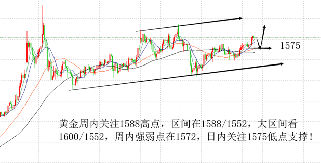 黄金本周开盘正常,维持在1583附近,本周黄金的重点在前高1588上,如果黄金强势延续破位1588,那么这一波黄金的强势再次开启,力度会延续到1600之上,但经过收线可以看到这个强势或在本周走弱,延续较难,虽然在强势中,日线还是保持区间范围内,区间可看在1588/1552,向上扩大区间在1600/1552,上方空间也有限,上涨不追单,建议周初以回落做多,周尾以做空为主,周内强弱点位在1572,破位1572开始看弱黄金,不破1572继续看强。从技术面来看,日线收阳,但H4周期还是收口状态,没有开口,因此暂时表现强势但无单边,早间开盘在1583附近震荡,延续上周五的高点,低位支撑在1578/1575附近,因此美盘如果到1575之后可以顺势做多看涨,需要关注周内高点1586/1588是否破位。