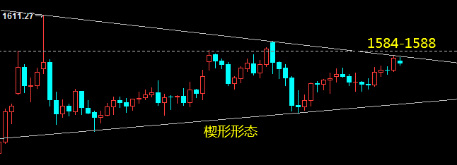 操作上,1584精准空单保本持有,晚间反弹继续进空即可;若意外见1586-1588依旧是空;上破1588表明中线失效,再跟进调整点位;