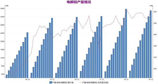 3、据SMM数据显示,12月(31天)中国电解铝产量303.6万吨,同比增加1.47%,2019年中国电解铝总产量3542.5万吨,同比减少1.84%。