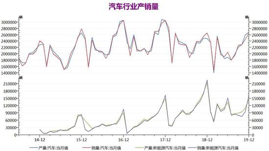 新能源汽车方面,2019年12月中国新能源汽车产量和销量分别完成14.93万辆和16.34万辆,较上月分别增加36%和71.37%,较去年同比下降30.28%和27.36%。累计方面,2019年1-12月中国新能源汽车产量和销量分别完成124.19万辆和120.60万辆,产销量比上年同期分别下降2.25%和4.00%,增速较1-11月由正转负分别减小6.01个百分点以及5.27个百分点。2019年我国新能源汽车市场产销量同比下降,也是自2009年大力推广新能源以来首次负增长。不过纯电动汽车累计产销同比分别增很脏10.8%和5.9%,增速高于行业水平。今年中国新能源汽车的补贴政策将保持稳定,加上行业进入洗牌期竞争加大,将有利于市场需求的回暖,预计今年产销整体将有小幅增长。