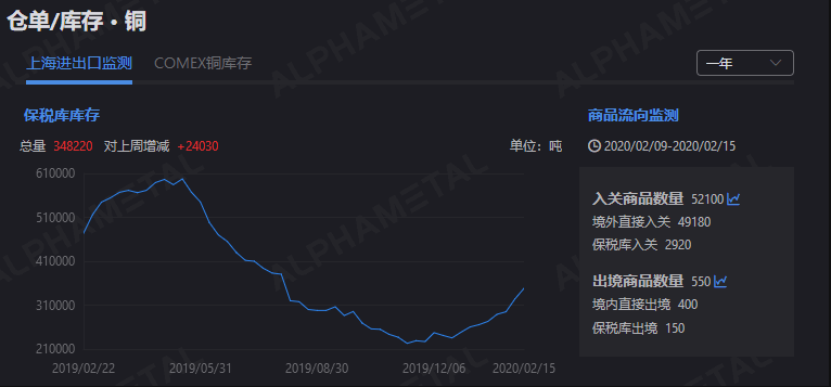据Alphametal数据监测显示,年前沪伦比触底反弹,截至目前依旧处于下行趋势中。上周沪伦铜虽小幅反弹,但偏内弱外强,故沪伦比继续下滑。介于市场对后期需求恢复的预期存在,暂时铜价下行空间有限,沪伦比或维持区间格局。但短期在国内疫情的影响下,消费预期将延后兑现,且复苏强度仍存不确定性,进口铜需求短期或将持续疲软状态,同时保税库存或将继续增加。