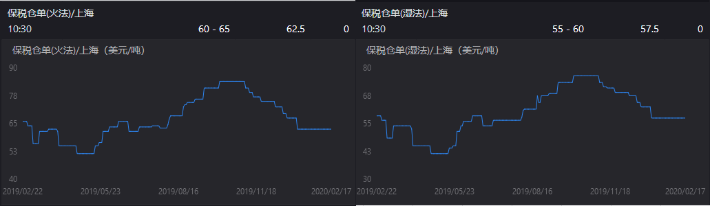 保税区库存较上周继续增加,一方面去年底开始由于临近春节需求出现下滑,进口盈亏持续倒挂,且亏损逐步放大,外贸铜询价与成交日渐减少,库存量触底反弹。另一方面春节期间国内冠状疫情致使国内下游与终端企业延迟复工,遭遇需求瓶颈所致。截至目前下游工厂虽逐步复工,但进度缓慢,且物流运输尚未恢复,综合来看现货需求仍将继续疲软,在消费恢复前保税库存或将续增。截至今日保税仓单溢价均值为60美元/吨,位于年内均值下方。