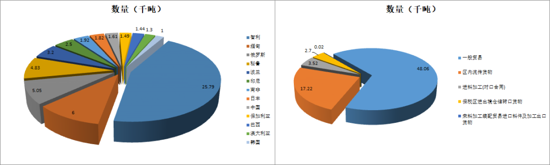 上周两千吨以上进口国中智利、缅甸与俄罗斯进口量最多,合计总量约3.68万吨,占总进口量的约51.2%。其中一般贸易性质约4.81万吨,占总进口量约66.7%、区内流传货物为1.72万吨,占总进口量约23.9%、进料加工(对口合同)约0.35万吨,占总进口量约4.9%。出口总量为0.77万吨,较上周增加约0.76万吨。