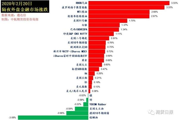 今晨美股标普500指数涨0.47%;欧洲Stoxx50指数涨0.69%;美元指数涨0.16%;WTI原油涨3.11%;Brent原油涨2.91%;伦铜涨0.33%;黄金涨0.63%。美豆涨0.67%;美豆粕涨0.27%;美豆油跌0.33%;美糖涨1.01%;美棉涨0.91%;CRB指数涨0.97%,BDI指数涨3.33%。离岸人民币CNH贬0.09%报7.0132;德银X-Trackers嘉实沪深300中国A股ETF涨0.63%。