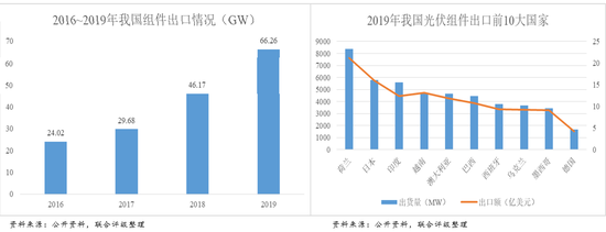 我国为光伏产品出口大国。以组件为例,2019年,我国组件出口量达到66.26GW,预计占我国全年组件产量的比重可超50%。其中,前10大海外市场共进口我国组件达46GW,共计约117.35亿美元。