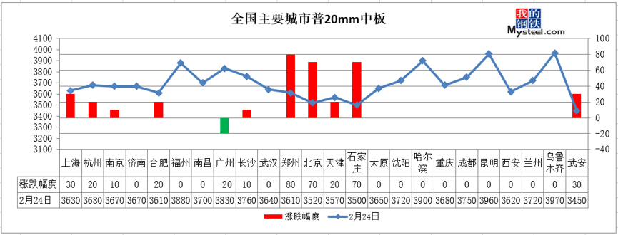 中厚板:24日,全国24个主要城市20mm普板均价3695元/吨,较昨日上涨14元/吨。其中,上海、杭州、南京、合肥、长沙、郑州、北京、天津、石家庄、武安等10个市场上涨10-80元/吨,广州市场下跌20元/吨。