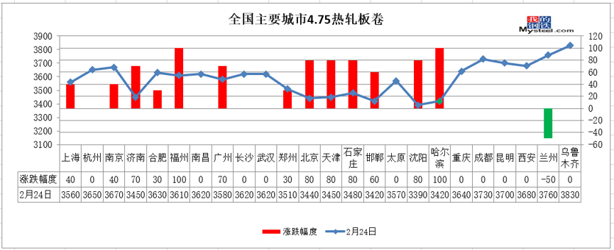 热轧板卷:24日,全国24个主要城市4.75mm热轧板卷均价3585元/吨,较昨日上涨34元/吨。其中,上海、南京、济南、合肥、福州、广州、郑州、北京、天津、石家庄、邯郸、沈阳、哈尔滨等13个市场上涨30-100元/吨,兰州市场下跌50元/吨。