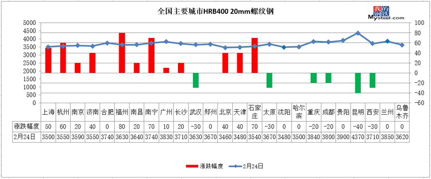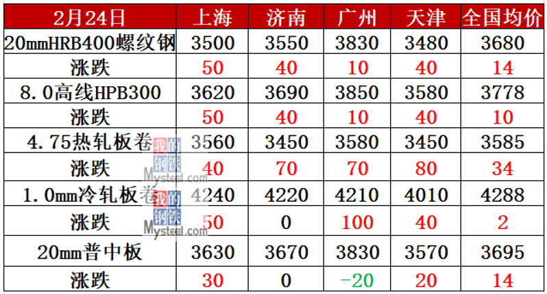 2月24日,全国累计10家钢厂发布调价信息,累计调整幅度在0-280元/吨。