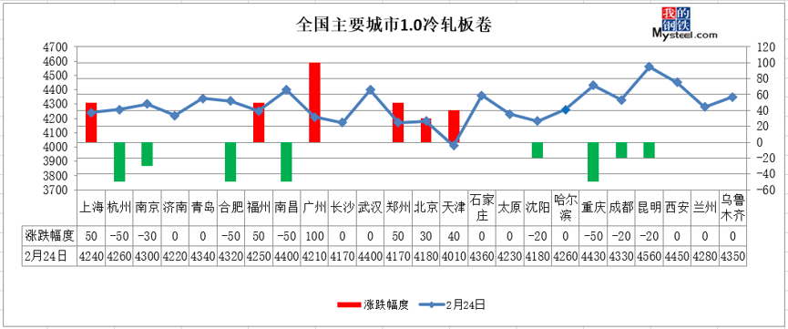 冷轧板卷:24日,全国24个主要城市1.0mm冷卷均价4288元/吨,较昨日上涨2元/吨。其中,上海、福州、广州、郑州、北京、天津等6个市场上涨30-100元/吨,杭州、南京、合肥、南昌、沈阳、重庆、成都、昆明等8个市场下跌20-50元/吨。