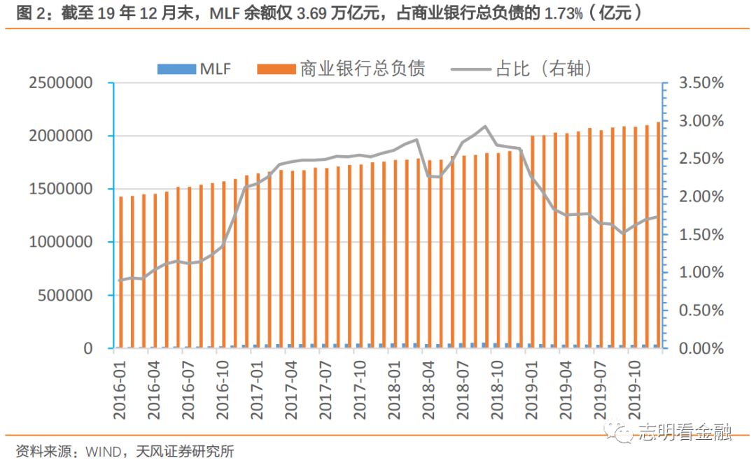若存款基准利率不动,LPR降息更似单边降息。截至19年12月末,MLF余额3.69万亿元,商业银行负债总额213.09万亿元,MLF在商业银行负债中占比仅1.73%。由于MLF占商业银行负债中占比很低,MLF利率下调5BP对商业银行负债成本率直接影响仅0.09BP。