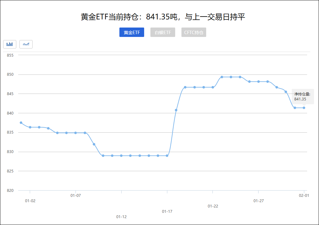 第一黄金网2月2日讯 2月1日监测数据显示:截至2月1日,美国商品期货交易委员会黄金ETF持仓量为841.35吨,与上一交易日持平。